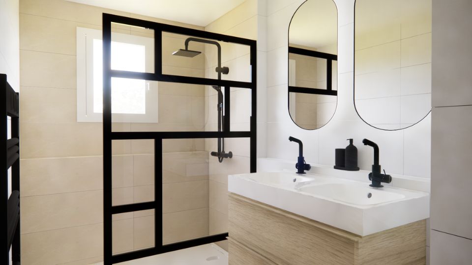 L’ancien carrelage du sol sera recouvert par un nouveau carrelage effet parquet et l’intégralité de la salle de bain sera carrelée. Le carrelage de l’espace douche sera dans les tons beige pour trancher avec le carrelage blanc mat du reste de la salle de bain.