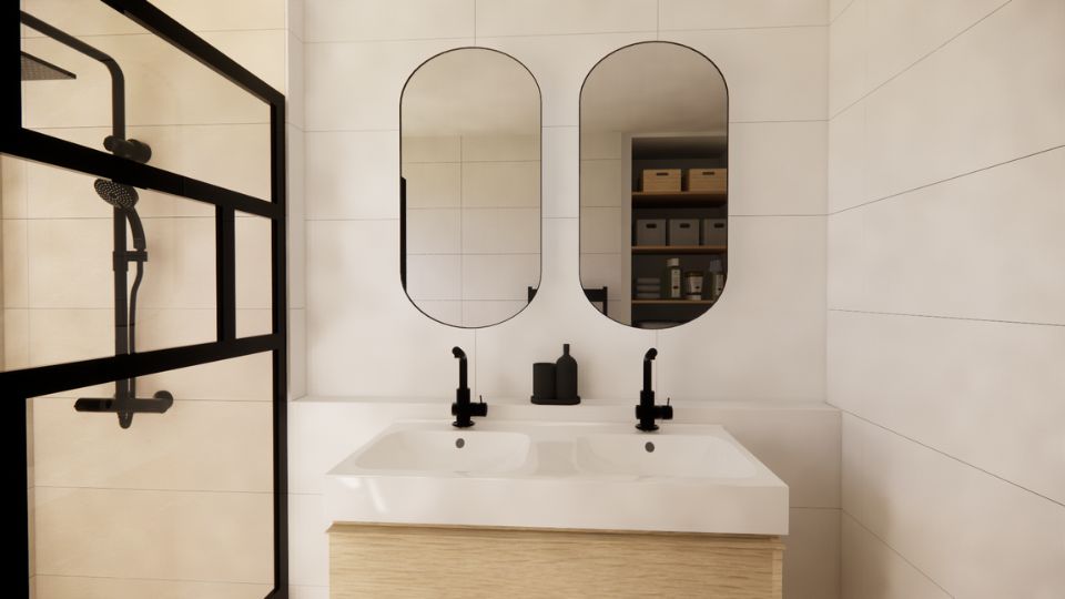 Dépose de la baignoire, du bidet et de l’évier par l’artisan choisi. Un espace douche est créé à la place de l’ancienne baignoire avec l’installation d’un receveur de douche en 170×90 cm. La paroi de douche sera sérigraphiée avec des bandes de séparation noires. Elle sera équipée d’un bras de support au plafond puisqu’impossible d’en avoir un latéral à cause de la fenêtre. La robinetterie sera de coloris noir (mitigeurs et colonne de douche). Création d’un coffrage sur la longueur du mur côté tuyauterie d’une hauteur environ 100 cm et d’une profondeur de 10 cm. Il permettrait de camoufler les tuyaux du bidet, de l’évier et ainsi de créer un décroché pour poser les produits de toilette dans l’espace douche. Le nouveau meuble suspendu double vasque effet chêne blanchi sera accompagné de deux miroirs ovales LED avec liseré noir.