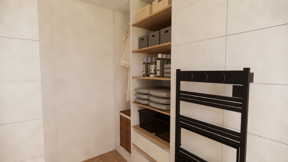 Un sèche serviette sera installé sur le mur côté placard dans le prolongement de la sortie de douche. Une nouvelle installation électrique sera prévue. Pour l’aménagement du placard, les anciennes étagères sont enlevées et des caissons sont ajoutés. Les anciennes portes coulissantes ainsi que le système de rail seront déposés, le placard sera désormais ouvert. Un caisson accompagné de tablettes sera installé au même endroit que les étagères d’origine et un second caisson sera ajouté pour garder l’espace penderie et ainsi mettre une panière à linge. Des solutions de rangements sont ajoutées : paniers, boites ainsi que housses pour ranger le linge de maison.