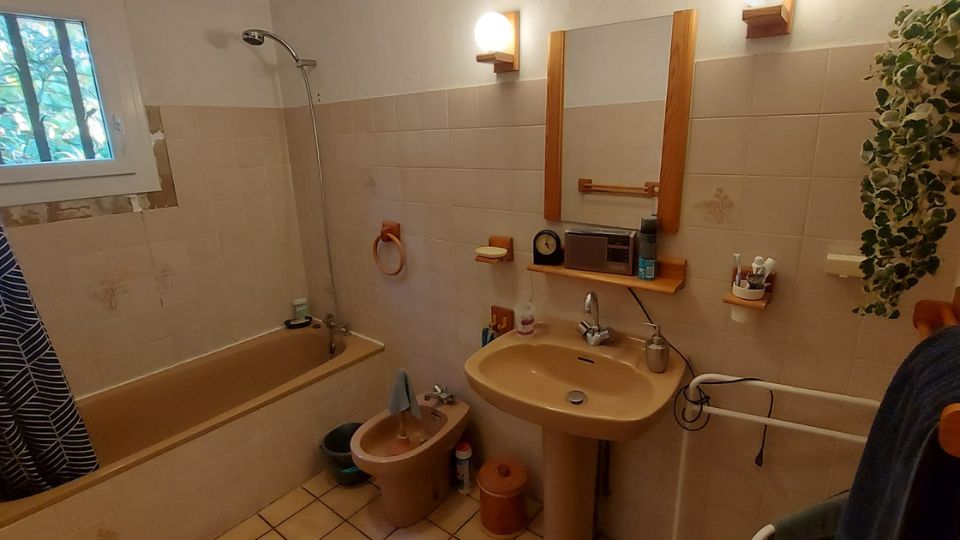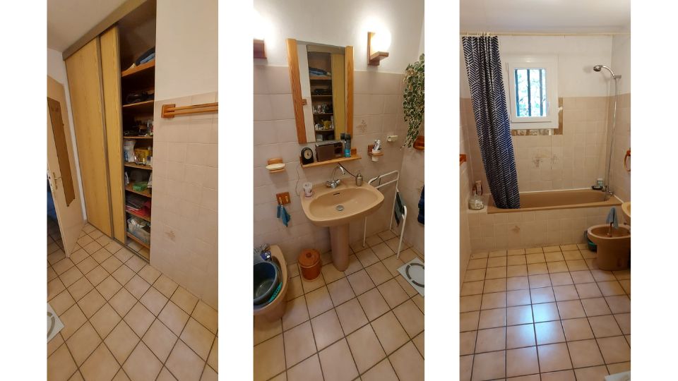 La salle de bain n’a jamais été rénovée depuis sa construction en 1987. Elle dispose d’une baignoire, d’un bidet et d’un évier sur pied. Un grand placard complète l’ensemble. L’objectif est de la moderniser, la rendre plus lumineuse et d’installer une douche à la place de la baignoire.