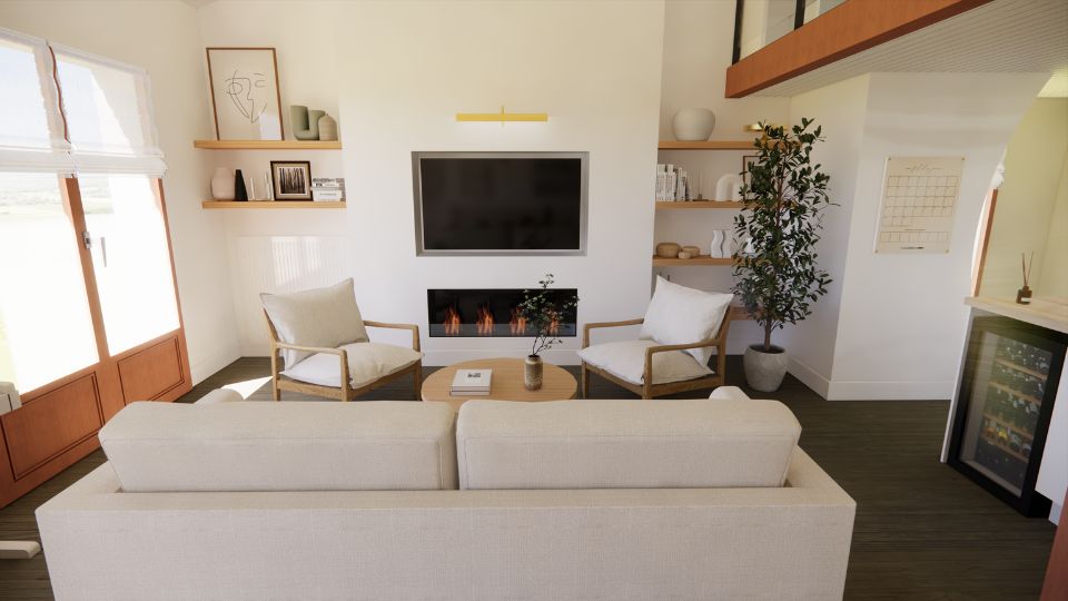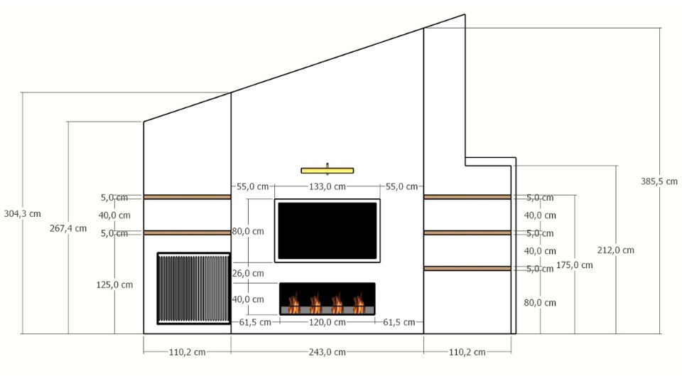 Ici gros changement puisque nous avons décidé de créer un coffrage placo pour intégrer la TV, cacher tout ce qui est consoles de jeux et décodeurs et encastrer une cheminée à l’éthanol. Des étagères de chaque côté viennent compléter l’ensemble.