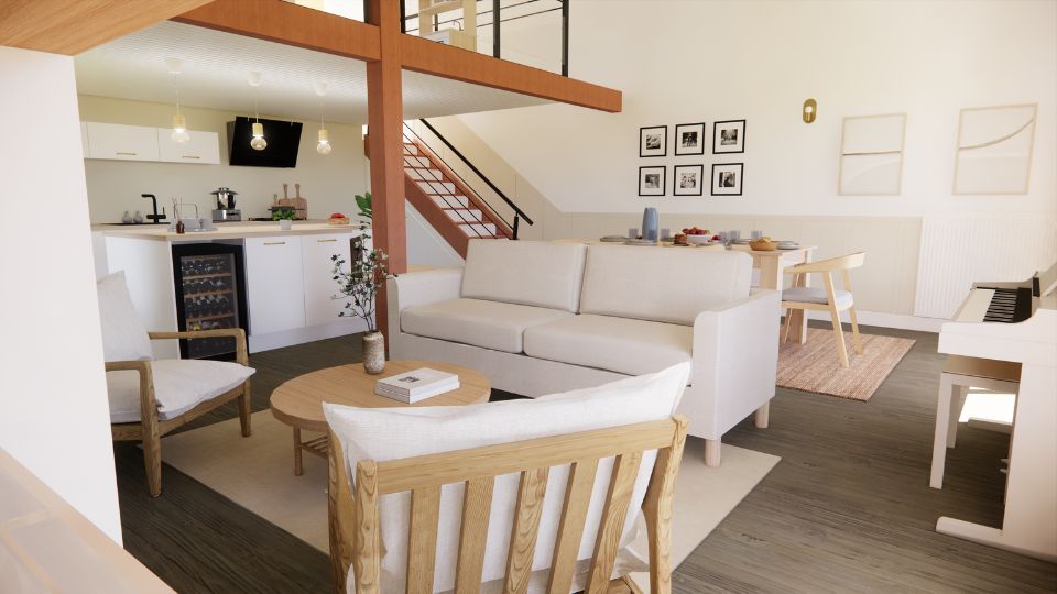 Un nouvel espace salon est créé, nous remplaçons le canapé avec méridienne pour un canapé plus petit et ajoutons des fauteuils ainsi qu’une table basse.